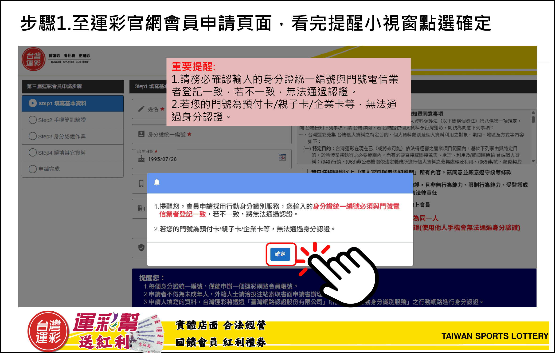 至運彩官網會員申請頁面時,請看完提醒小視窗,確認符合以下申請條件: